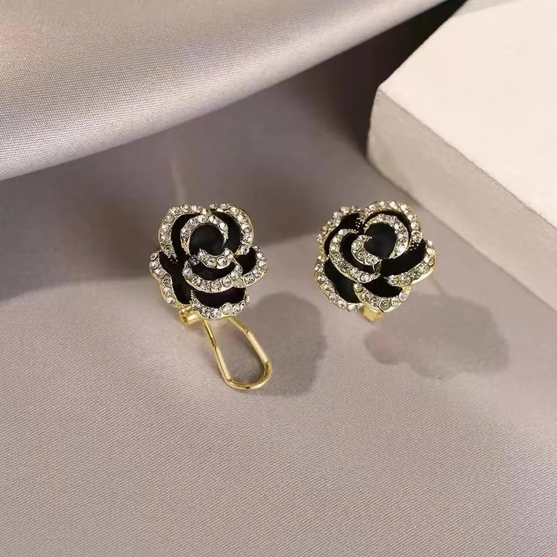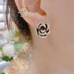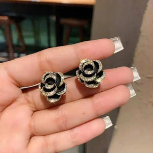 Rhinestone Black Camellia Stud Earrings for Women New Fashion Trend Simple Elegant Temperament Girl Party Jewelry Birthday Gift